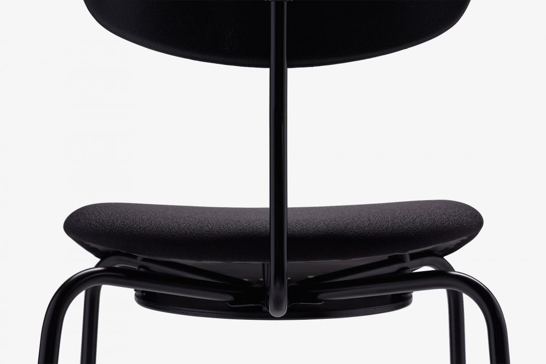 Der Dirigentenstuhl besitzt Streben zum Aufstützen der Füße. Das 4-Bein-Gestell besteht aus Rundrohr und ist schwarz beschichtet. Sitz und Rücken sind aus mehrfach verleimtem Buchefurnier gefertigt. In der gepolsterten Ausführung ist der Sitz serienmäßig mit Belüftungslöchern und einer Gummihaarpolsterung für besseren Sitzkomfort ausgestattet. Der Rücken hat eine schwarze Kunststoffabdeckung.