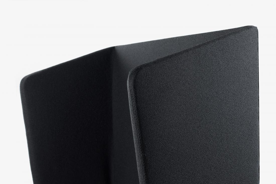 Das Schallschutzelement hat einen 3-Fuß aus dickwandigem Kunststoff. Das Standrohr besteht aus schwarz beschichtem Stahlrundrohr; das Auszugsrohr aus verchromtem Stahlrundrohr. Die Oberseite besteht aus 100 % Polyesterfilz in Anthrazit.